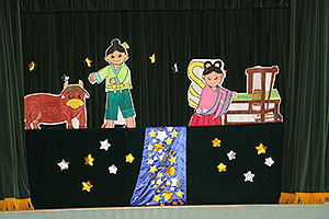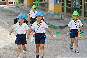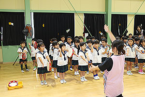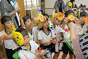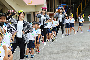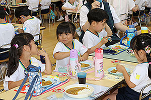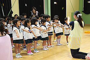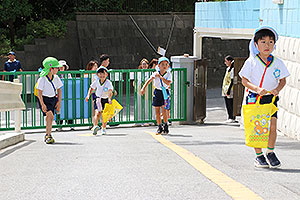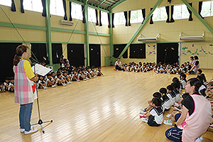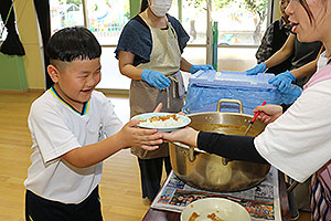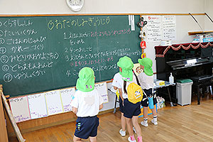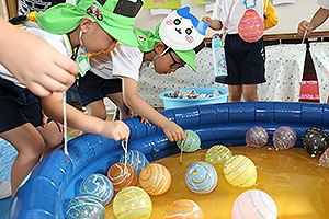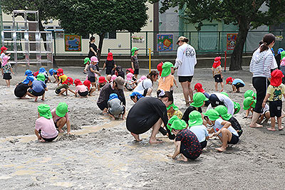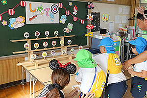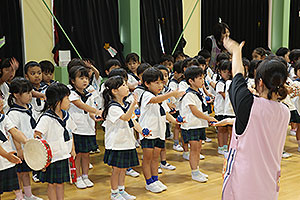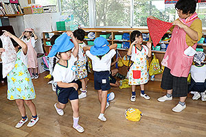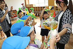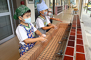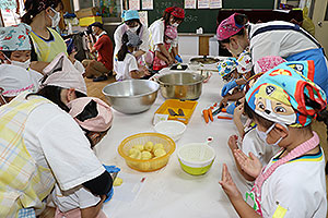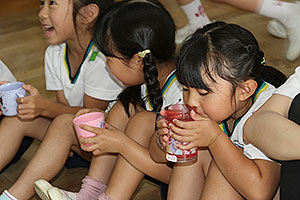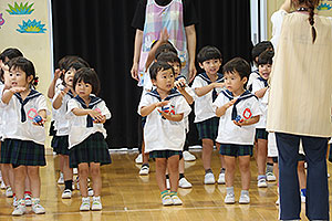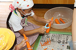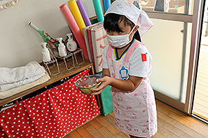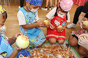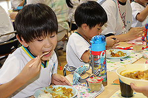 夏休みの初日、この日は年長組のお楽しみ行事。 午後から集まってきた子ども達は皆ニコニコ笑顔で、すぐにエプロンを身に付け、カレーライス作りです。 「目が痛ーい!!」「人参の皮むけたよ!」と皆真剣に取り組んでいました。 カレーを煮込んでいる間に、以前作った梅シロップをジュースにして皆で飲みました。 そしてその後は翠ヶ丘横丁! 先生達がいろいろ用意してくれた出店で、縁日気分を味わい、最後は皆で作ったカレーを食べ、大満足の1日でした。 |
